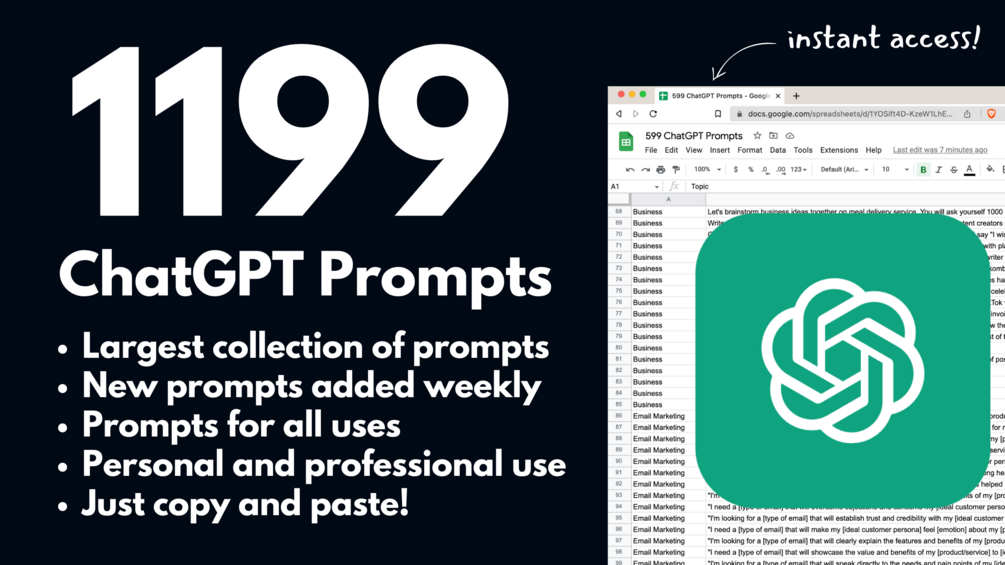 Instant access to the growing list of over 1199 ChatGPT prompts. This list is updated every week!